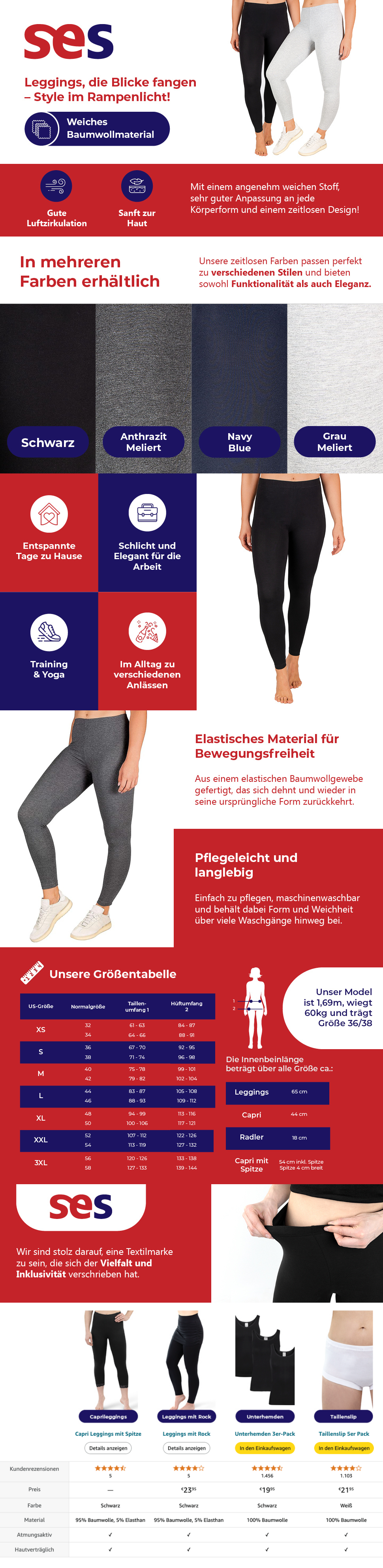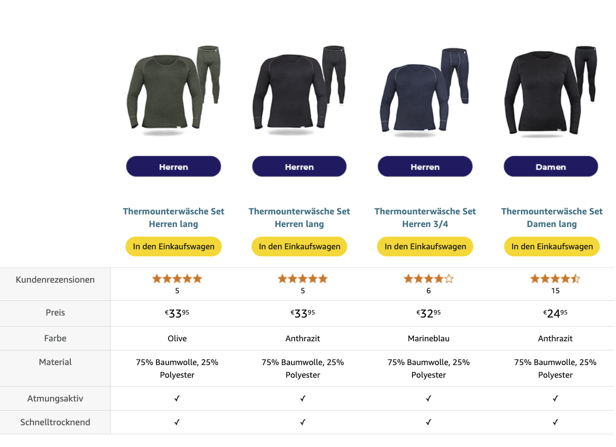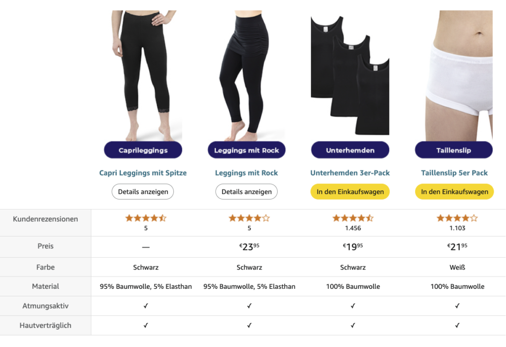 Der A+Content bietet zusätzlichen Platz für Informationen, Bilder und Produkt-Vergleiche, die wir auch bei SES Ströbele nicht ungenutzt gelassen haben. Ein besonders wichtiges Element bildet die Größentabelle, die im Bekleidungssektor essenziell für das Vermeiden von hohen Retourenquoten ist. Umso wichtiger, dass sie gut lesbar und schnell verständlich gehalten ist.